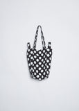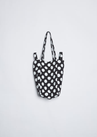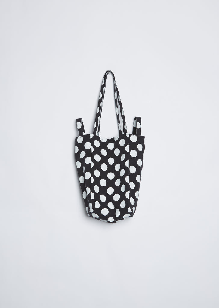 Amiacalva black polka dot tall medium tote bag with four handles in a printed nylon cotton canvas.