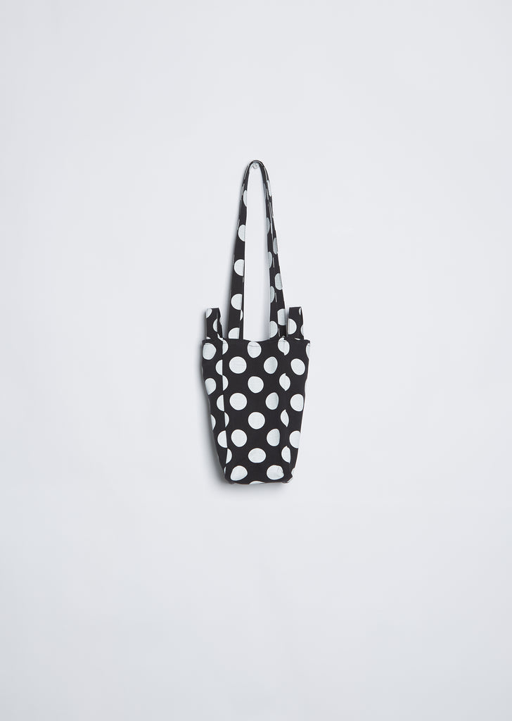 Amiacalva black polka dot tall small tote bag with four handles in a printed nylon cotton canvas.