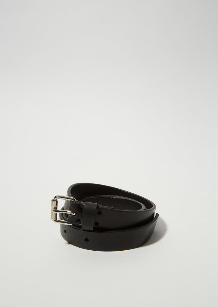 MHL by Margaret Howell black grained leather belt with polished silver-toned buckle. Raw edge finish.