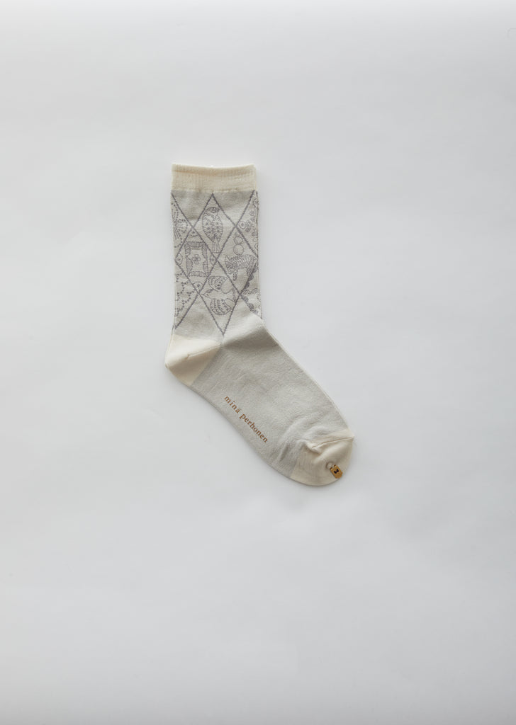 Fine-knit mid-calf knit sock stockinette-stitched from white cotton-blend jersey, featuring a light-grey jacquard diamond pattern with floral and avian motifs. Ribbed cuff.
