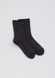 Minä Perhonen Karamelli Socks in black. Grid pattern ankle socks of black and grey tones detailed with a single blue line at back. Solid black elastic cuff trim, toecap and heel.