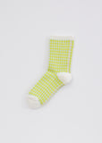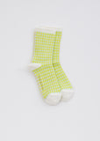 Minä Perhonen Karamelli Socks in yellow color. Grid pattern ankle socks of yellow and pale blue tones, detailed with a single pink line at back. Solid white elastic cuff trim, toecap and heel.