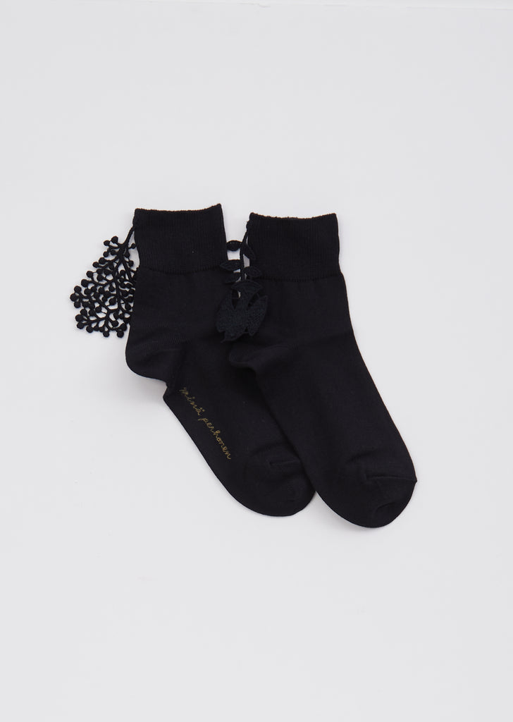 Minä Perhonen Forest Parade socks in black. Plain jersey socks with attached cut-out motifs of a dove and tree.
