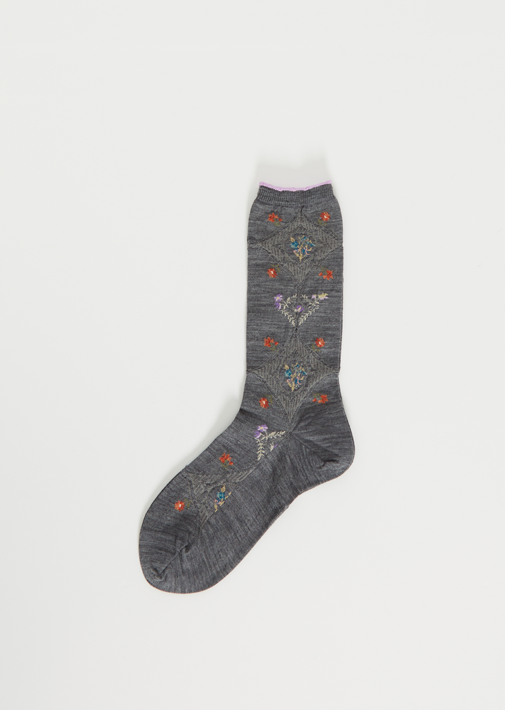 Antipast grey intarsia floral mid-calf socks with a diamond motif in a wool and nylon blended knit. Features a contrast purple stripe at the ankle cuff.