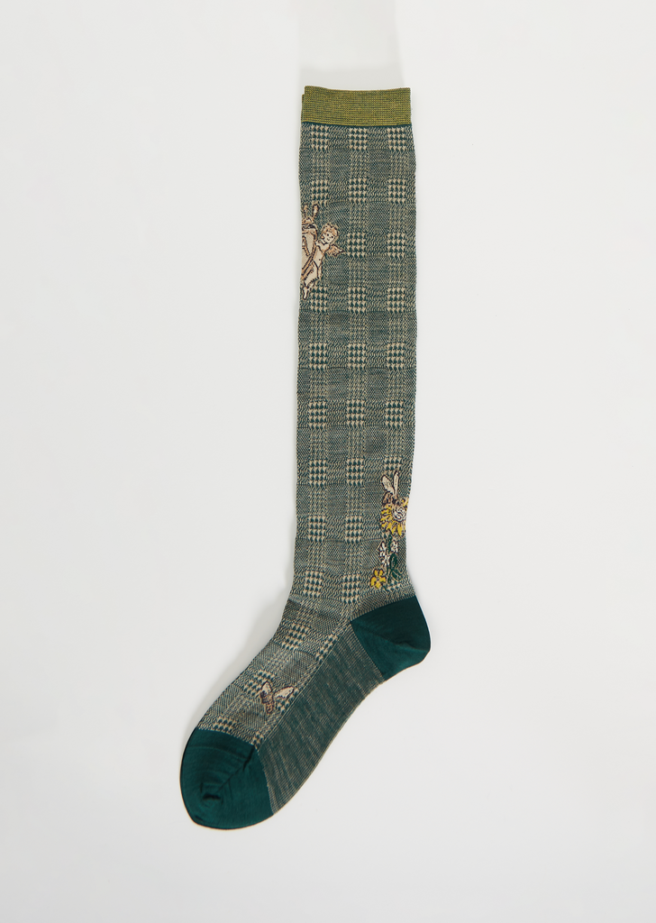 Antipast green houndstooth plaid tall socks with a branded emblem in a wool and nylon blended knit. Features a solid green toe and heel with a contrast ankle cuff.