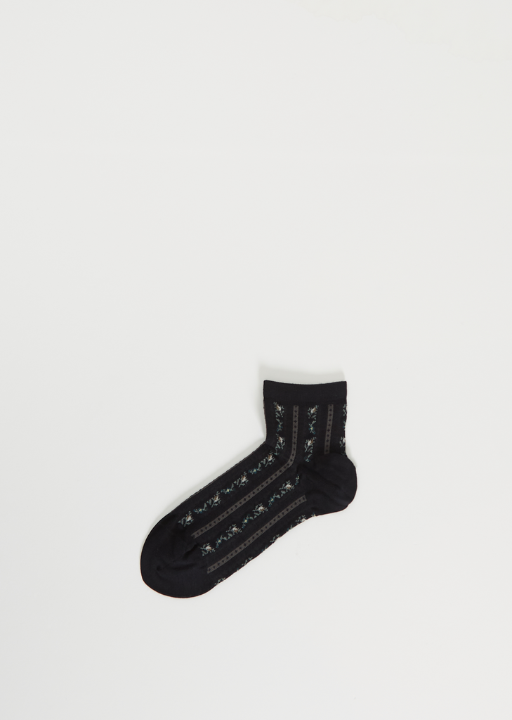 Antipast compression ankle socks with grey stripe motif in a black floral intarsia cotton blended knit. Features a tonal rib ankle cuff.