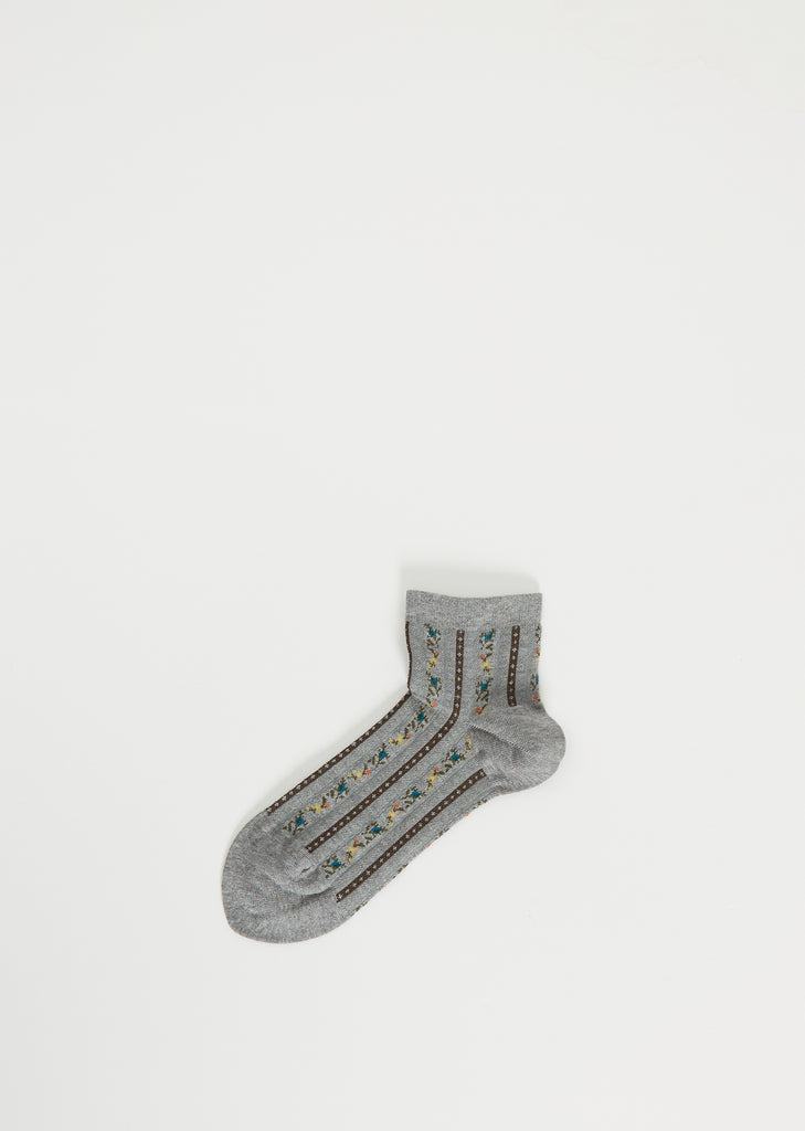 Antipast compression ankle socks with grey stripe motif in a mid grey floral intarsia cotton blended knit. Features a tonal rib ankle cuff.