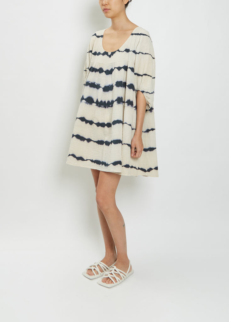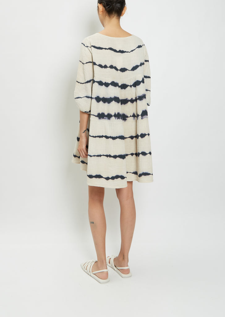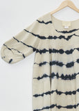Anaak natural toned black tie-dye scoop neck tiered mini dress with 3/4 sleeves in a crinkled gauze cotton.