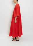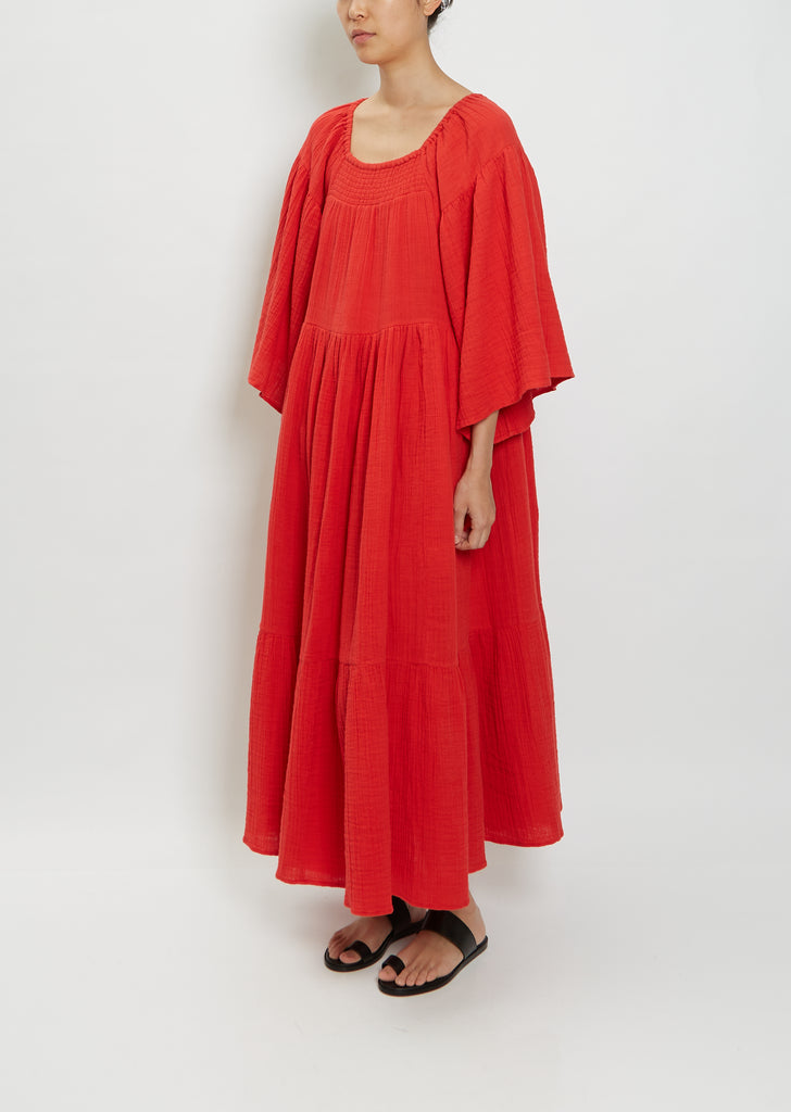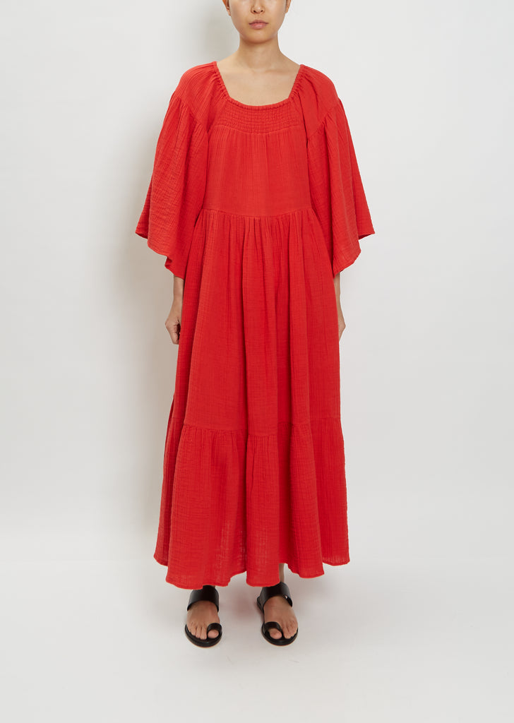 Anaak cherry red tiered maxi dress with a wide flutter sleeve and an elastic neckline in a crinkled gauze cotton.