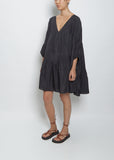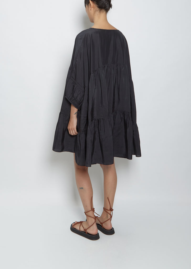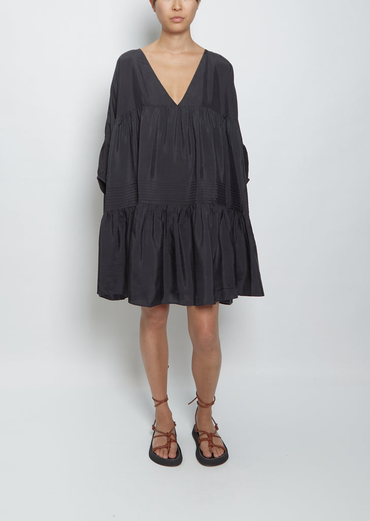 Anaak signature black v-neck tiered mini smock dress in a silk habotai.
