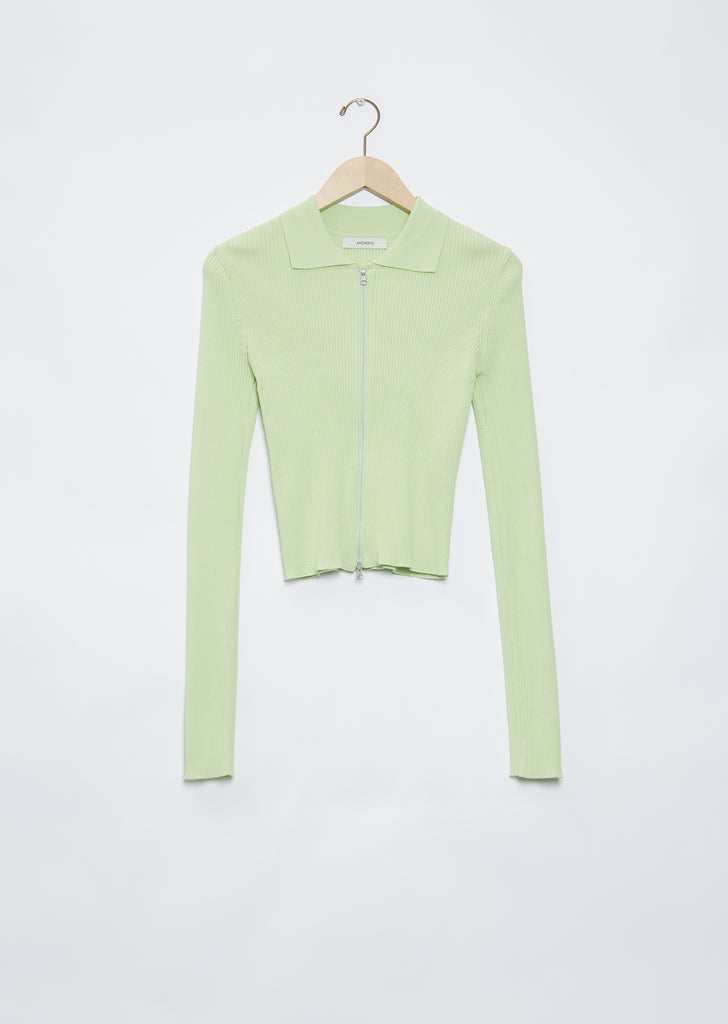 Amomento lime green shrunken two-way zip-up cardigan sweater with a pointed collar in a nylon blended rib knit.