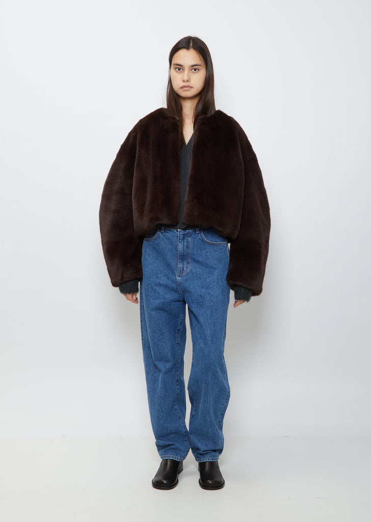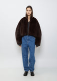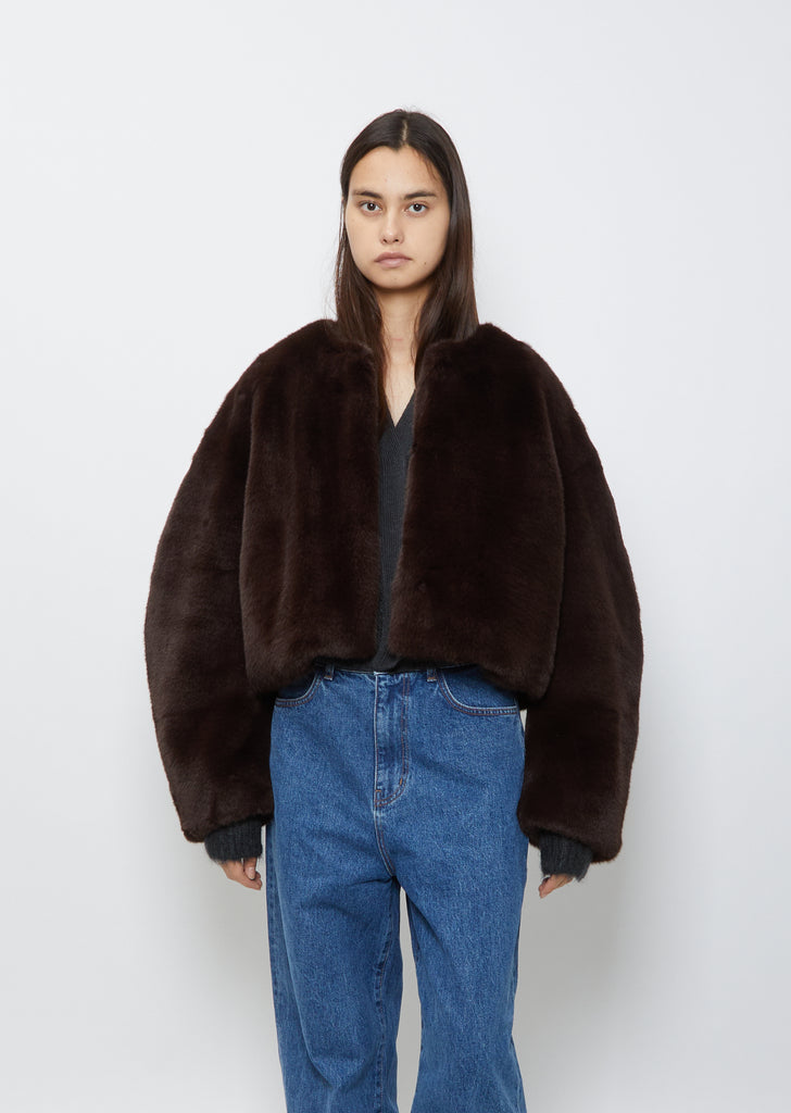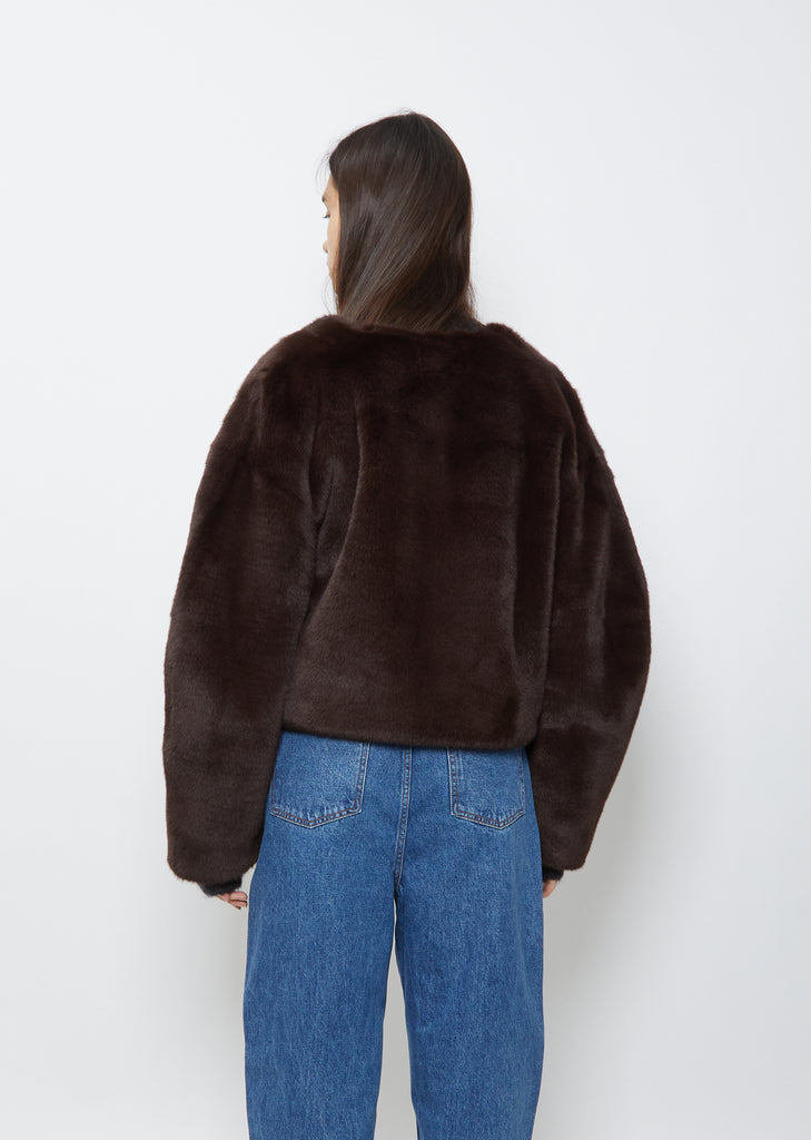 Amomento cocoon cropped eco (faux) fur jacket with crew neckline and a drop shoulder. This luxurious jacket features curved sleeves and tonal hook and eye closures at front. Fully lined. Slightly oversized fit.