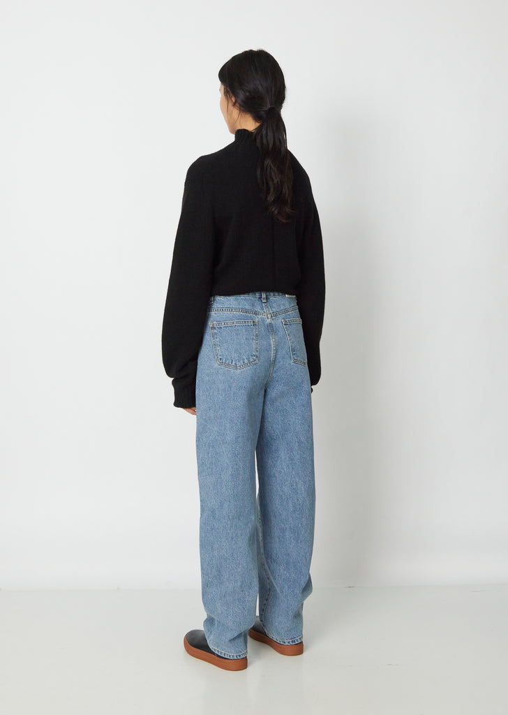Amomento high-waisted, wide-leg jeans in a light blue wash recycled cotton denim. Features 5-pocket styling with silver hardware and gold topstitching detail. White leather embossed logo patch at back right waistband. Relaxed fit with an oversized look.