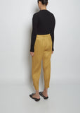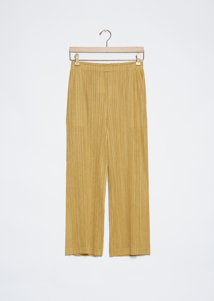Pleats Please ocher pull-on straight-leg pants with fine rib pleats in a shiny polyester.
