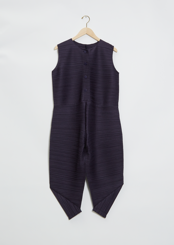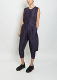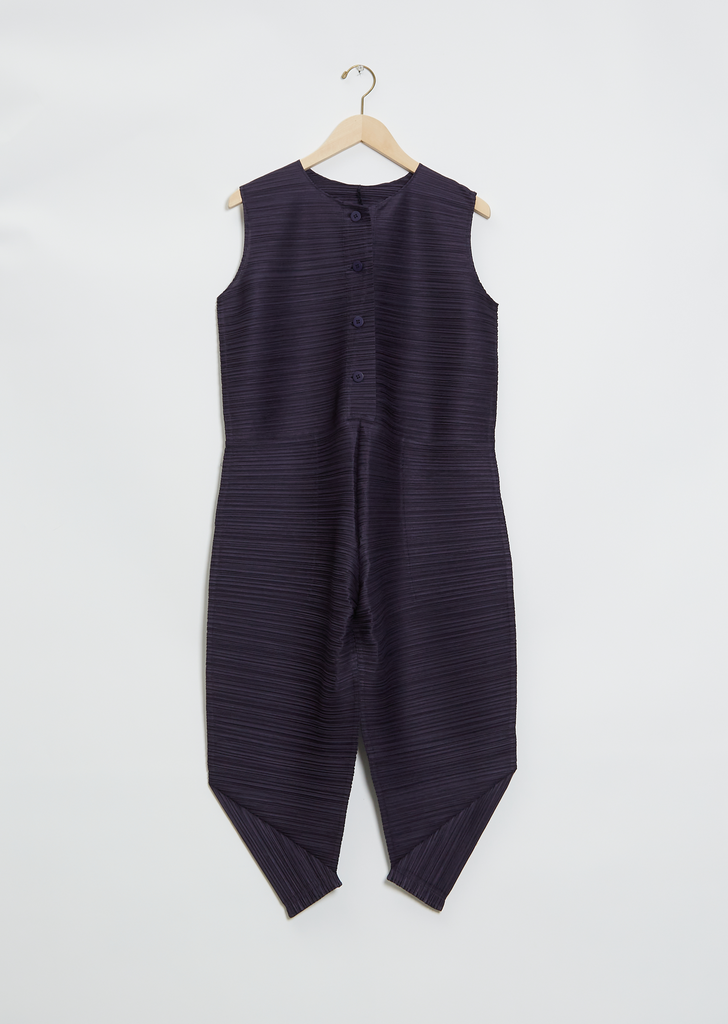 Pleats Please dark navy button down sleeveless jumpsuit with a removable self belt in a finely pleated polyester.
