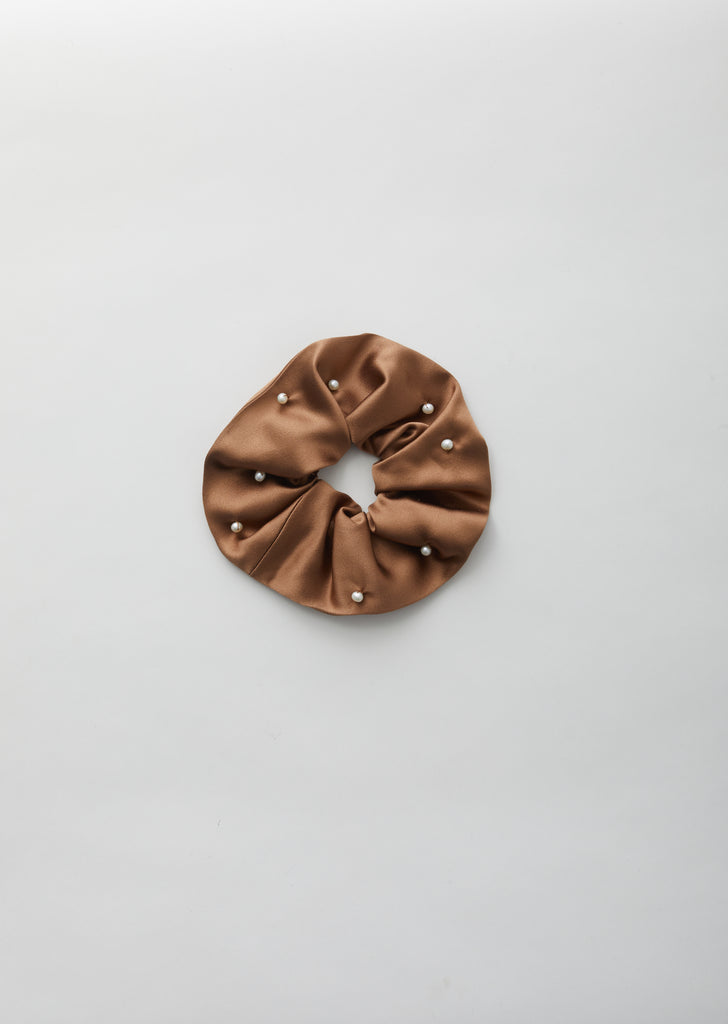 Handcrafted elasticized scrunchie in mocha-tone silk satin, embroidered throughout with small round pearls.