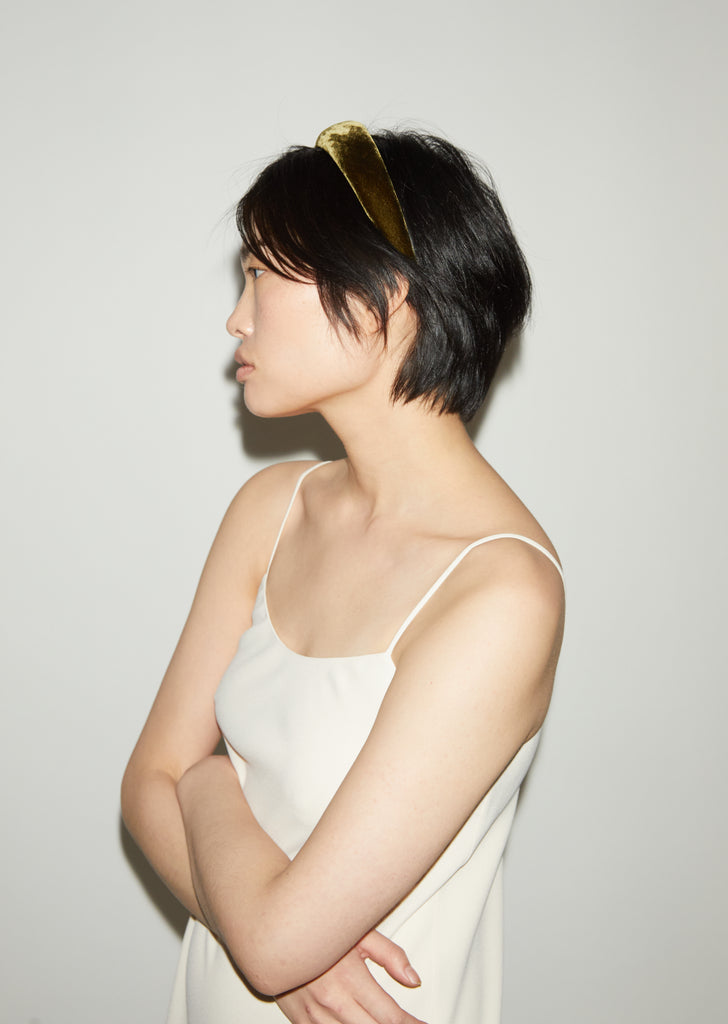 Deep-olive handmade headband crafted of padded silk velvet, in a minimalist design with no adornments.