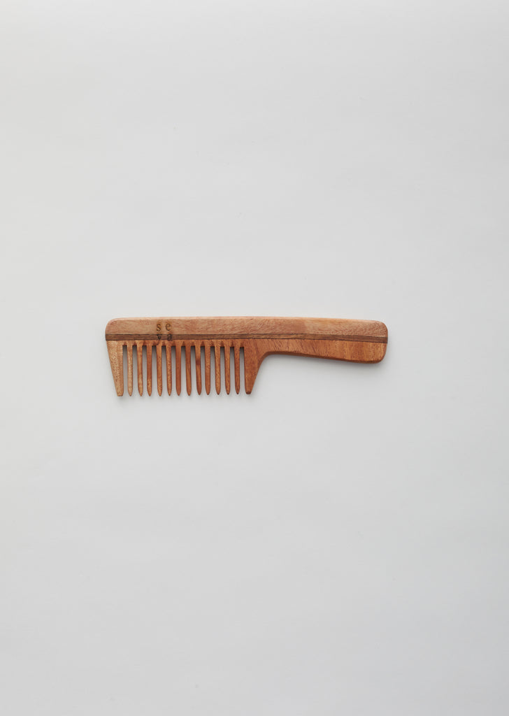 Ayurvedic wide-tooth handle comb hand-sculpted from naturally perfumed Japanese wood.