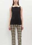 High Sport black sleeveless top with a slight peplum silhouette in soft cotton and lycra blend knit. Features a square neckline and side slits.