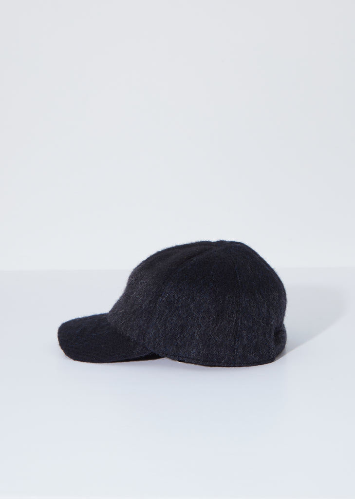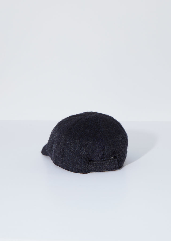 Stephan Schneider Micropaedia Cap in Blocks. Wool newsboy-style hat in a faint check pattern with black, dark navy and grey tones.