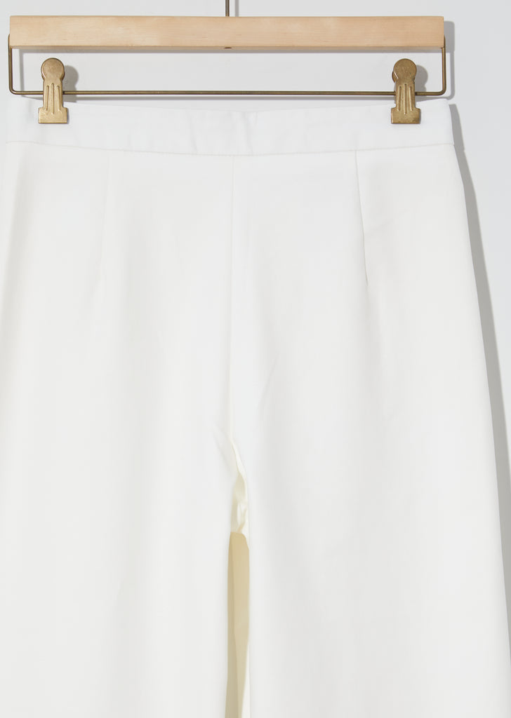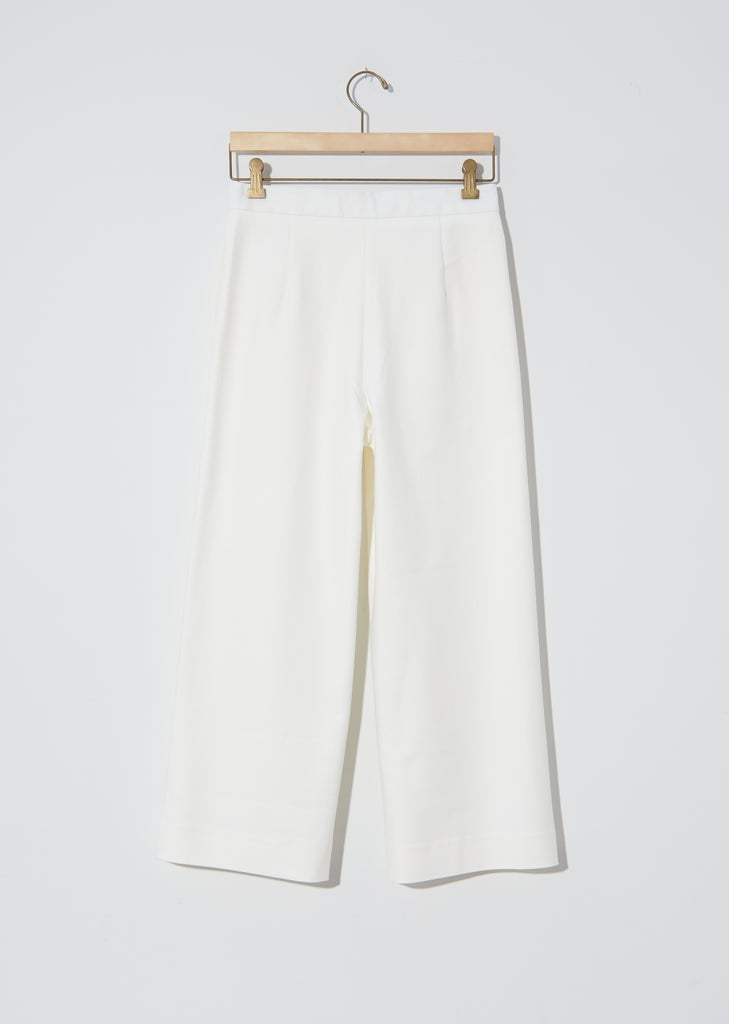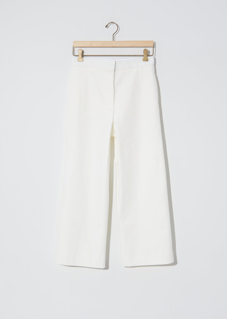New Brand — Arch The Cotton Trousers in Ivory. Cropped length, stretch cotton trousers with a clean waistband. Crafted in a mid-weight cotton sateen with stretch, this fabric makes for a comfortable, flattering trouser with a higher waist, slim fit on the hips and wide, cropped legs.