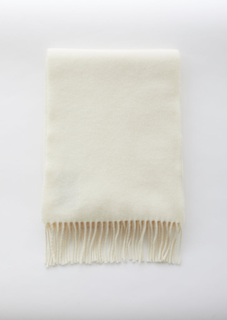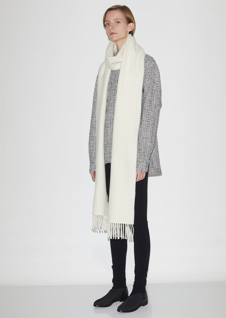 Extra-long rectangular scarf crafted from a soft ivory virgin-wool blend. Self-fringed ends. Textile logo patch at corner.