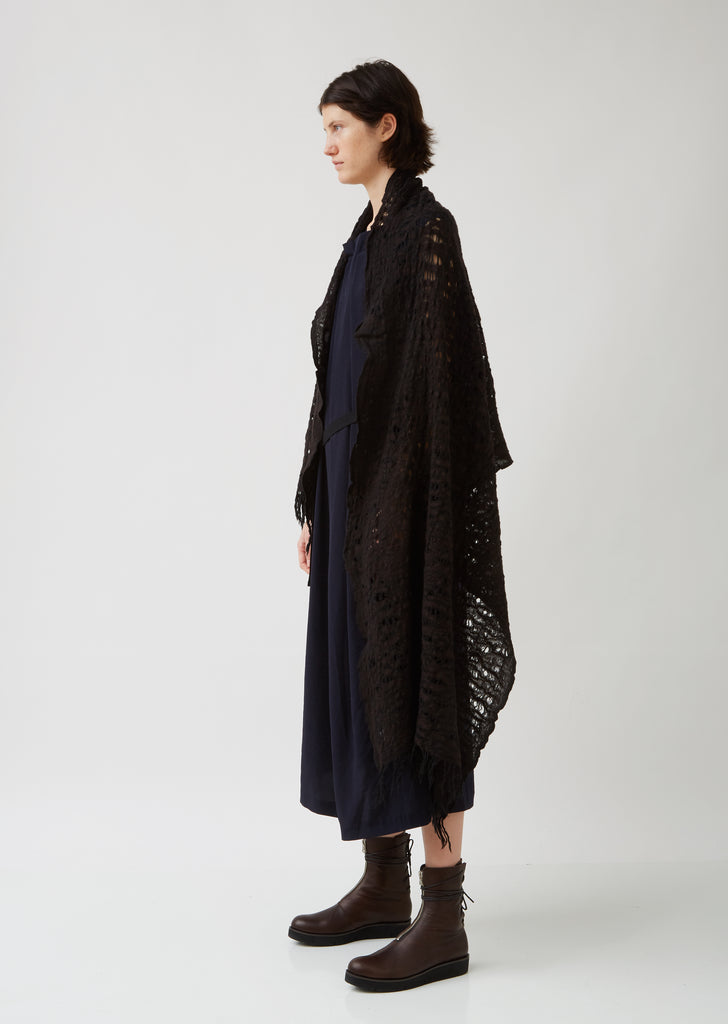 Black gauzy stole is given delicate hole openings throughout squiggle-weave wool. Inspiration by traditional Japanese feather-stitching. Fringe detail at edges.