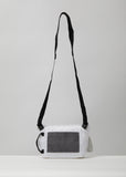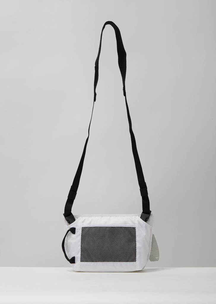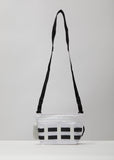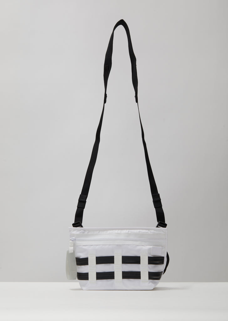 White-and-black unisex crossbody bag in ripstop nylon canvas, finished at the front with striated rubberized trims and the brand’s signature embroidered Face appliqué. Features a removable strap and a webbing side handle for optional hand-carrying.