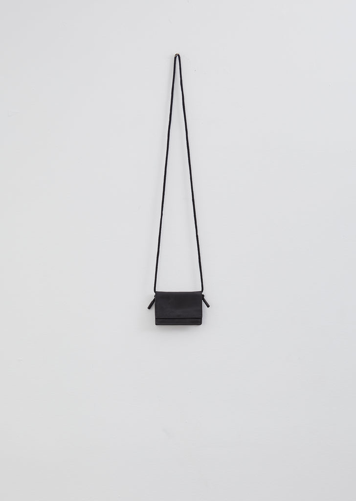 Ann Demeulemeester Crossbody Mini Pouch in Bozen Black. Crafted in leather, this card-holder style micro bag features two interior pockets and adjustable cording shoulder strap with leather covered ends.