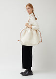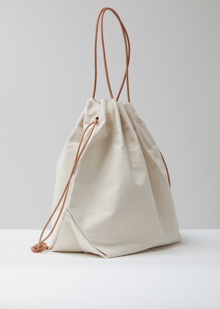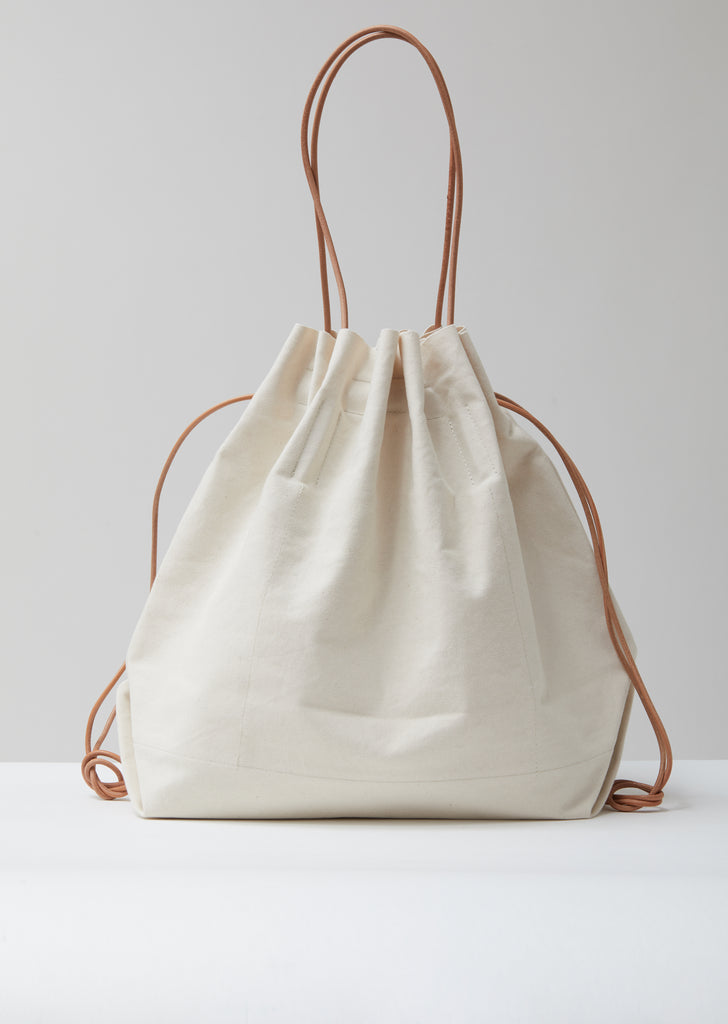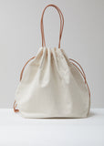 Horizontal tote bag constructed from water-resistant white cotton canvas, featuring a drawstring top closure that creates a bucket silhouette when fastened. Round peachy-beige leather carry straps for shoulder- or hand-carrying. Round, knotted-end peachy-beige leather drawstring at topline. Gusseted bottom. Single interior compartment.