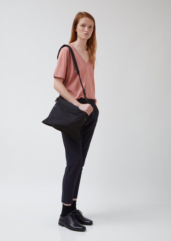Medium flat square-shaped shoulder bag in durable black tech-gabardine—a practical unisex style from the Osaka-based label, available in three sizes. Two-way zip-top closure; tonal leather zip pulls. Single grommet at both sides. Removable, adjustable flat padded shoulder strap; tonal metal lobster-claw/D-ring closure. Tonal looped leather logo tag at strap closure. Can be repurposed as a travel pouch.