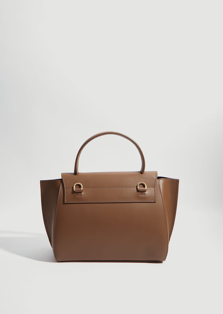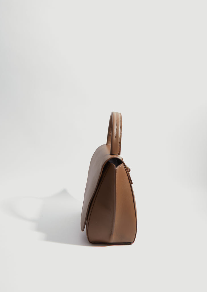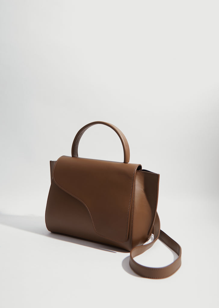 ATP Atelier Arezzo Vacchetta Bag in Khaki Brown. Crafted in vegetable tanned leather in Italy, signature structured top handle bag from the Stockholm based label.