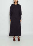 Blue Blue Japan long dolman sleeve dress with an elasticated back waist made from dark indigo cotton jacquard. Features tuck detailing at front waist and elongated buttoned cuffs at sleeves. Concealed side seam pockets. Center back zipper closure. A-line skirt hem.