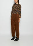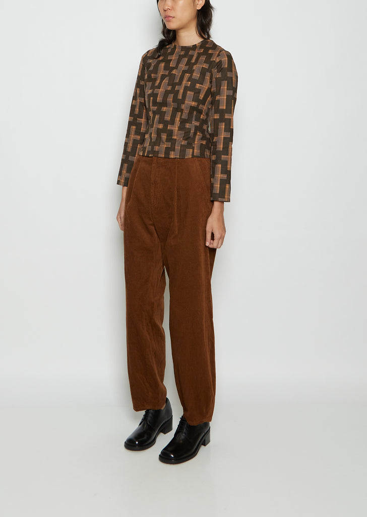 Blue Blue Japan brown multi long sleeve blouse with self ties and covered button closure at open back made from printed cotton. Shaped waist silhouette.