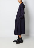 Blue Blue Japan tonal floral indigo jacquard pleated dress in cotton. Features a waist seam with pleating on the front left and sleeve cuffs, creating a balloon shape. Side slit pockets with an invisible zipper at back neck with a dropped shoulder. Slightly oversized fit.