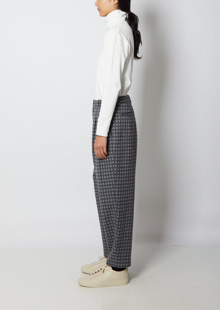 Blue Blue Japan wool pleat front trousers in a grey and charcoal plaid motif. Features two front side slit pockets and two back welt pockets. Elasticized waistband with belt loops and a black button front fly closure. Tapered leg with a relaxed fit.