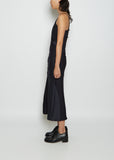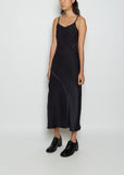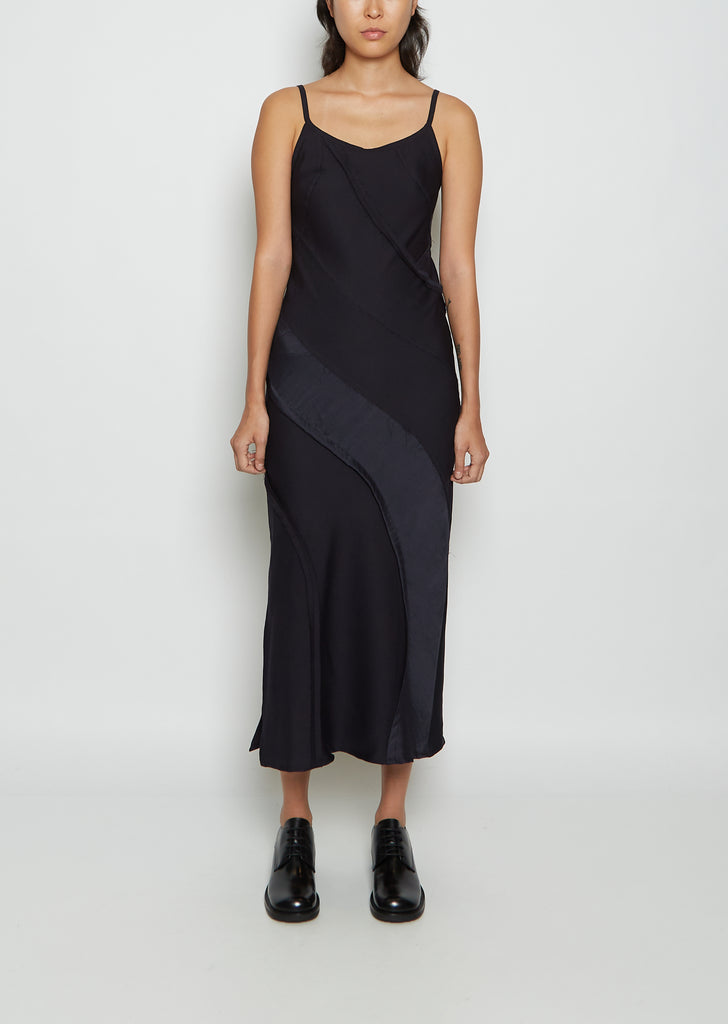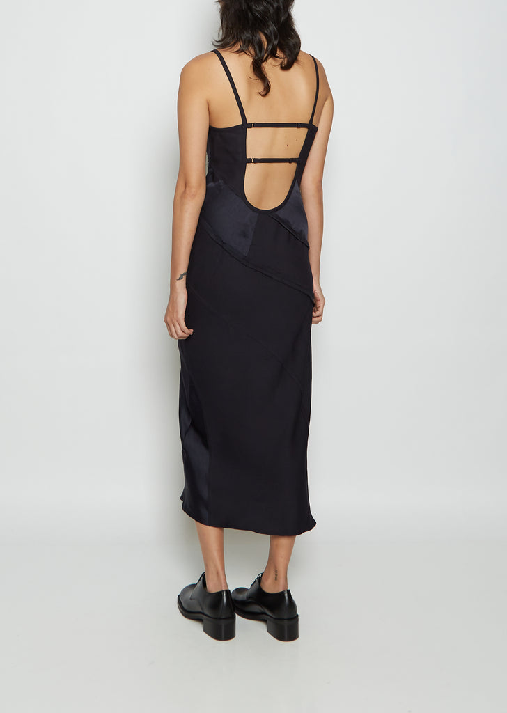 Blue Blue Japan navy camisole dress with raw-cut diagonal paneling and scoop back with double adjustable cross straps made from fluid rayon blend with slight stretch.