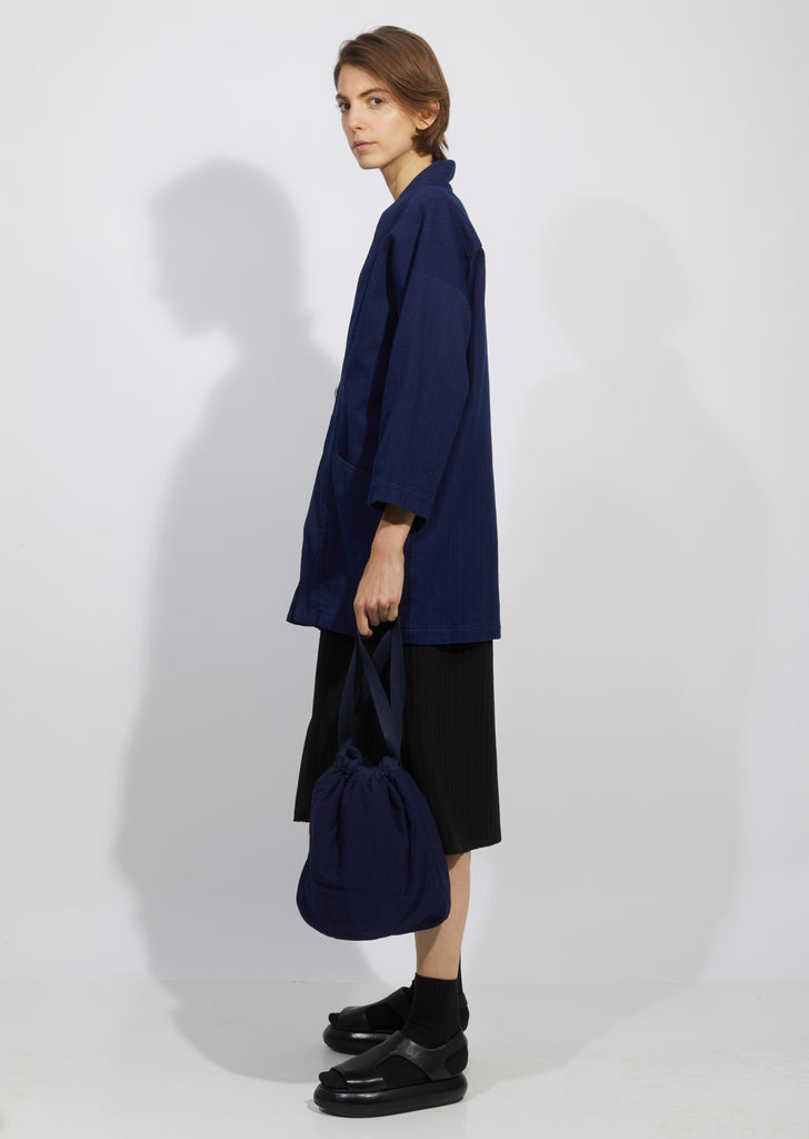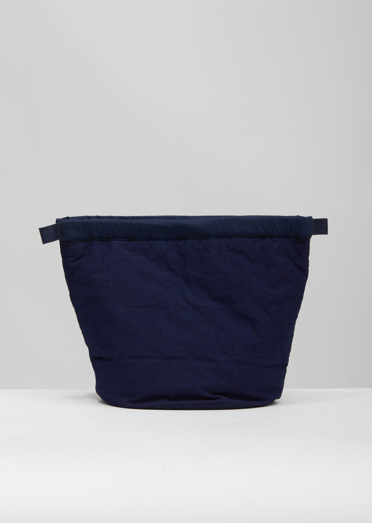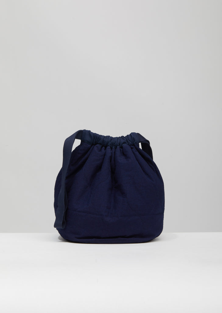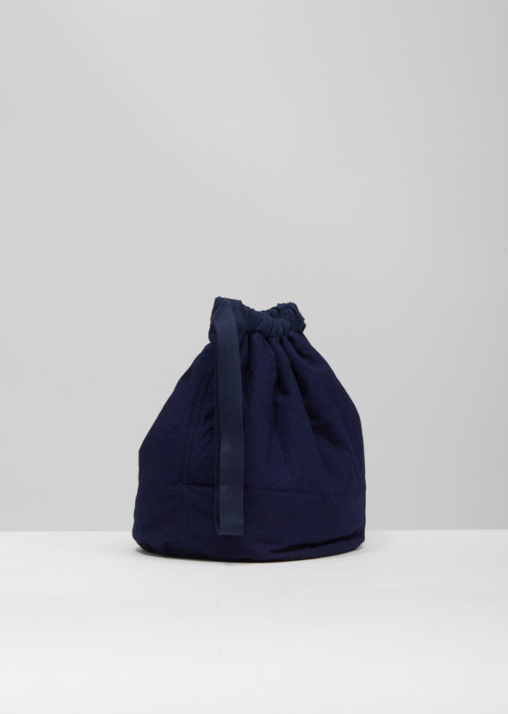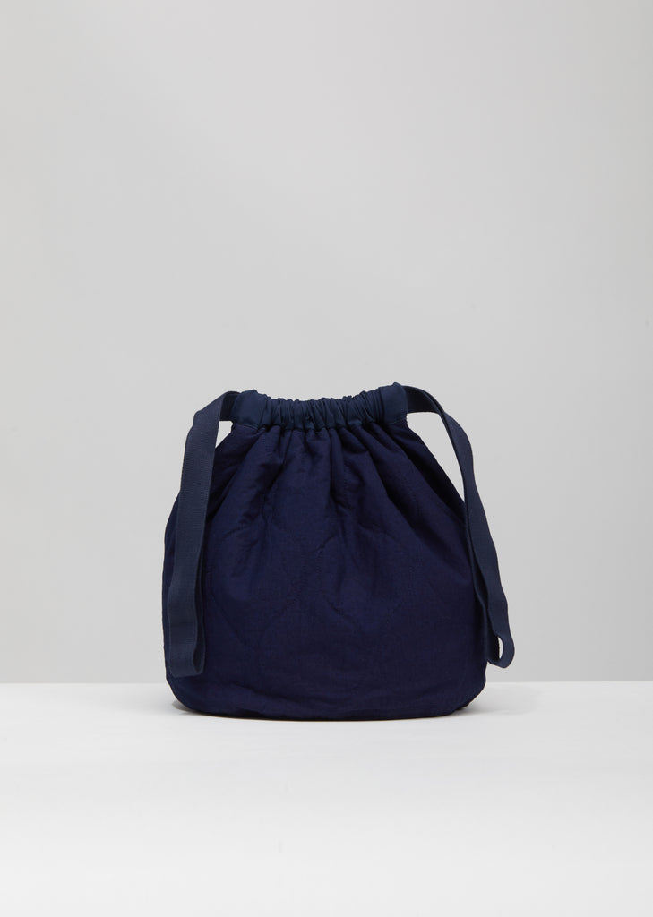 Navy drawstring pouch crafted of quilted cotton broadcloth with a curvilineal top-stitched design.