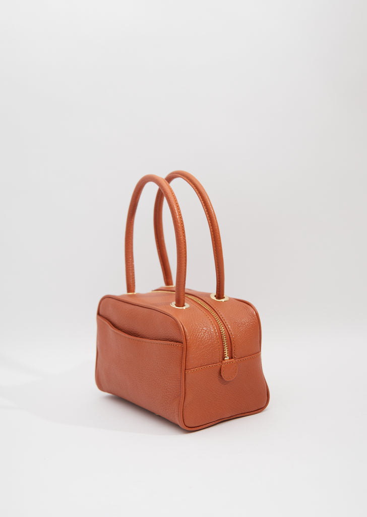 By Far Martin Bag in Cognac. Crafted in Spain with Italian grained leather, and loved for its petite proportions, new mini tote featuring a roomy interior, exterior pocket and topped with a curved double handle.