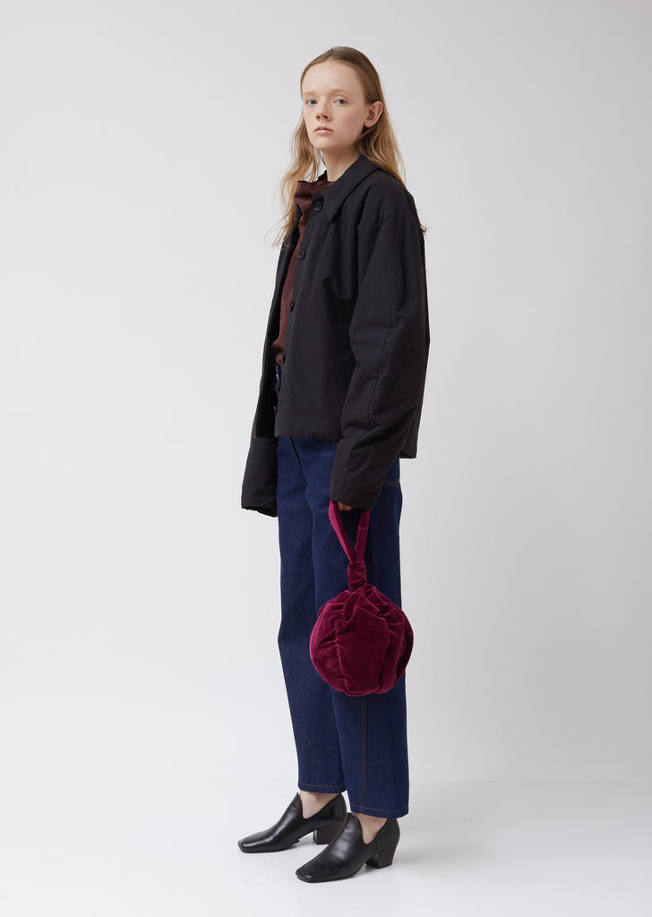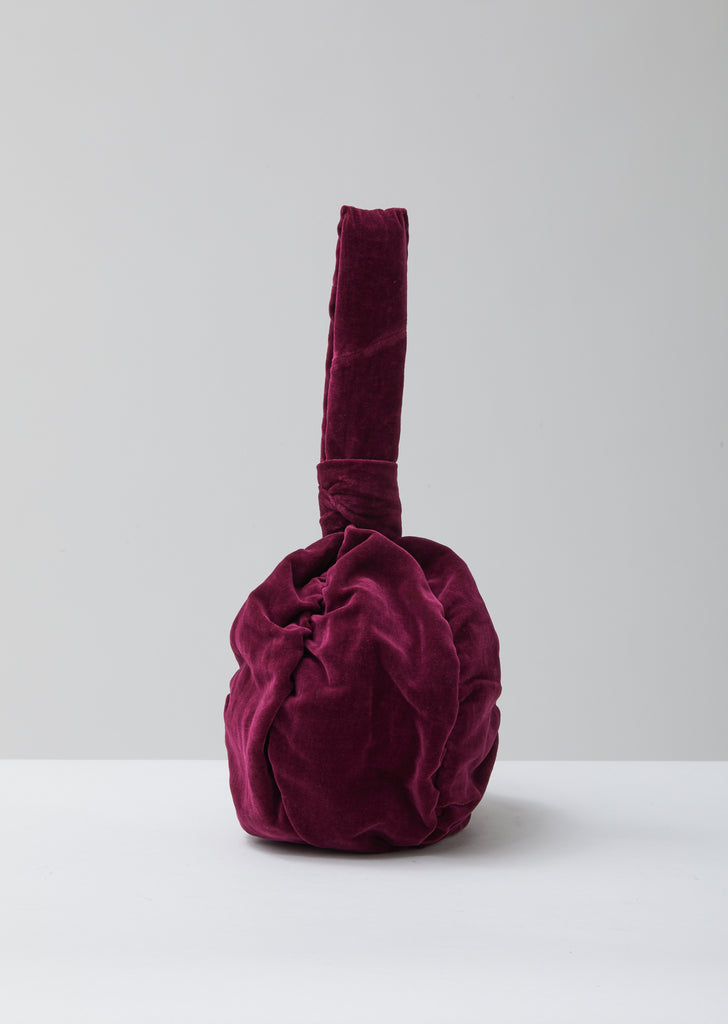 Small round ruched-detail purse bag in magenta cotton-linen velvet. Designed for hand-carrying. Looped, knotted carry handle. Partially exposed side-zip opening; tonal velvet pull; silver-tone metal hardware. Ruching at seams. Cotton lining.