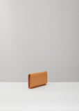 Natural-tone structured rectangular clutch in double-tanned full-grain calf leather, finished with a natural vegetable wax that allows a beautiful patina to develop over time. This minimal, front-flap style is designed with a removable, adjustable carry strap for crossbody wear.