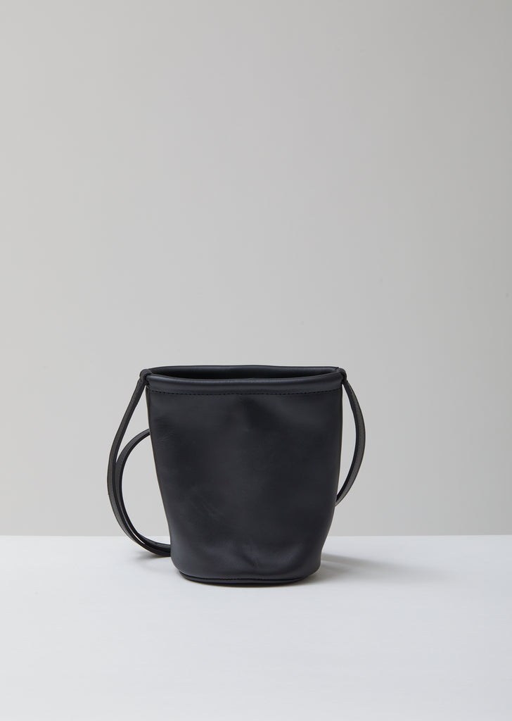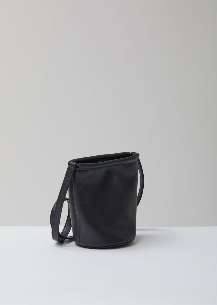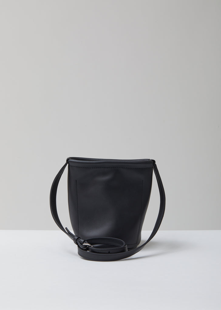Mini bucket bag with slightly tapered lines and an adjustable buckled shoulder strap, imagined in black double-tanned full-grain calfskin. The leather has a natural vegetable-wax finish and develops a patina over time. Softly structured. Concealed snap-button tab closure. Minimal silver-tone metal hardware. Small interior slip pocket. Tonal top-stitched geometric detail at front. Unlined.