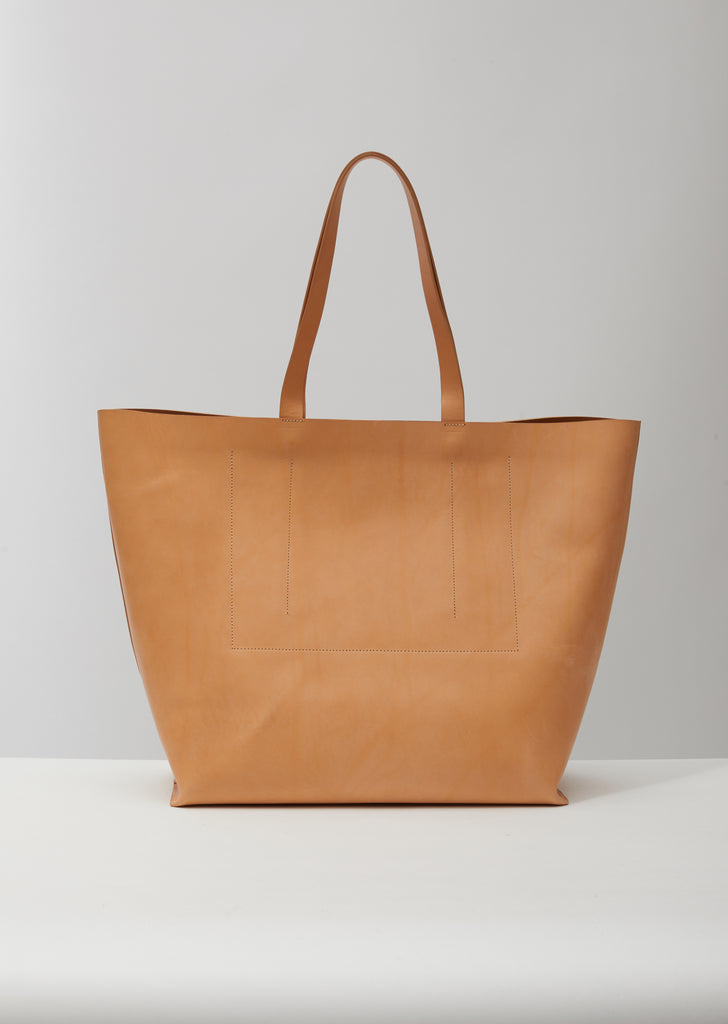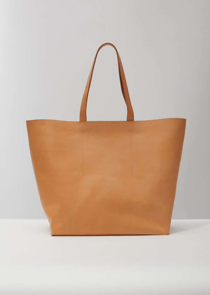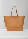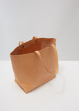 Natural-tone soft tote bag in double-tanned full-grained calf leather, finished with a natural vegetable wax that allows a beautiful patina to develop over time. This spacious, open-top style includes two generous self-leather straps that allow for hand-carrying and shoulder wear.
