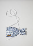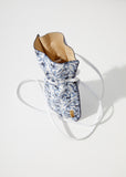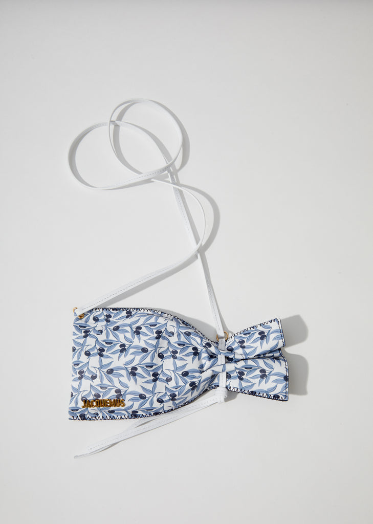 Blue-and-white drawstring-pouch bag in grained calfskin leather featuring an olive-branch print. This lightweight spring-summer accessory, inspired by traditional lavender sachets, is designed with a slim white leather crossbody strap.
