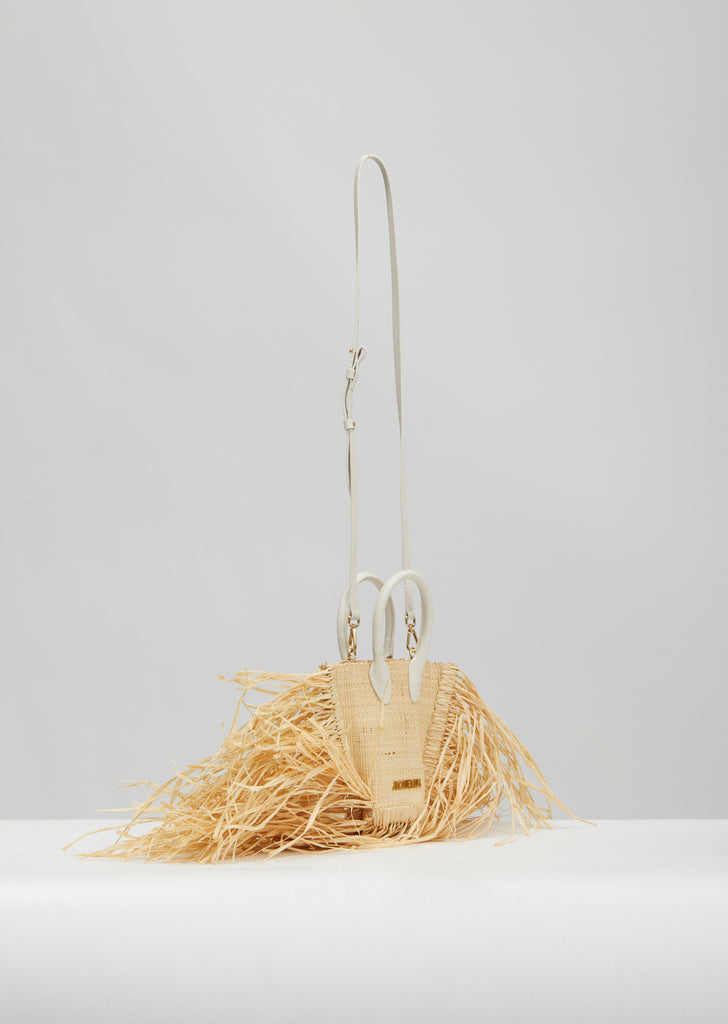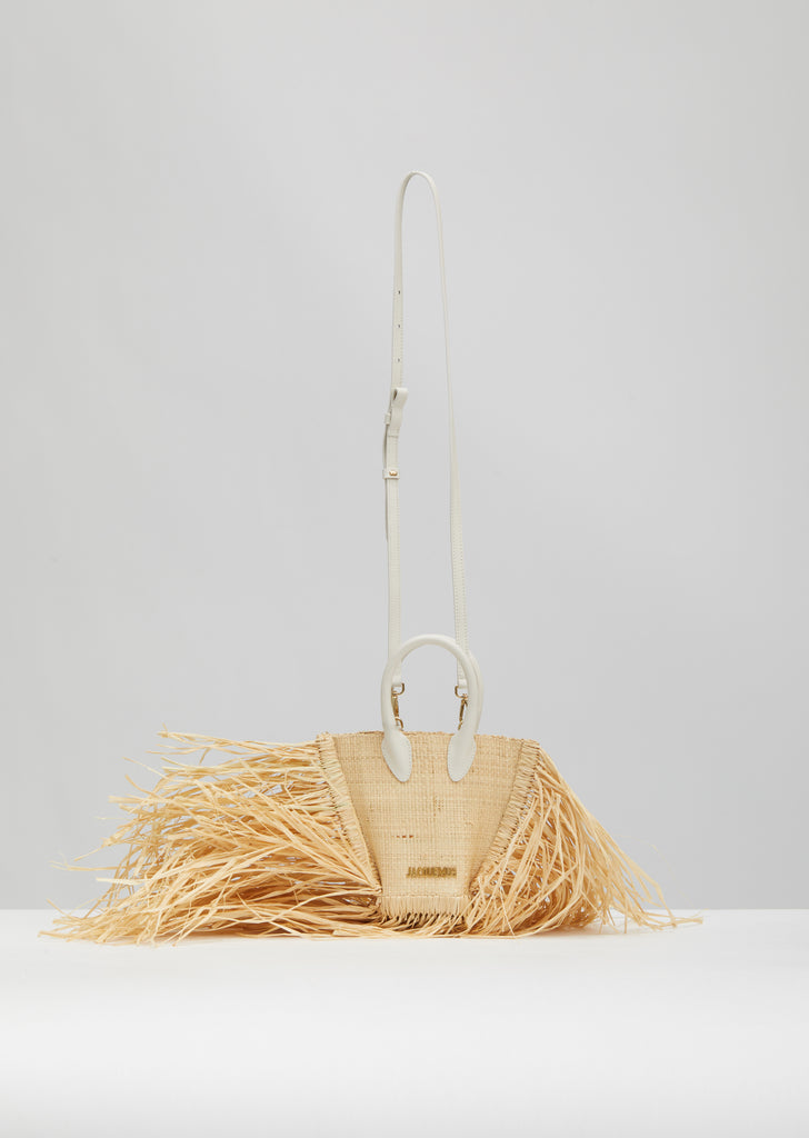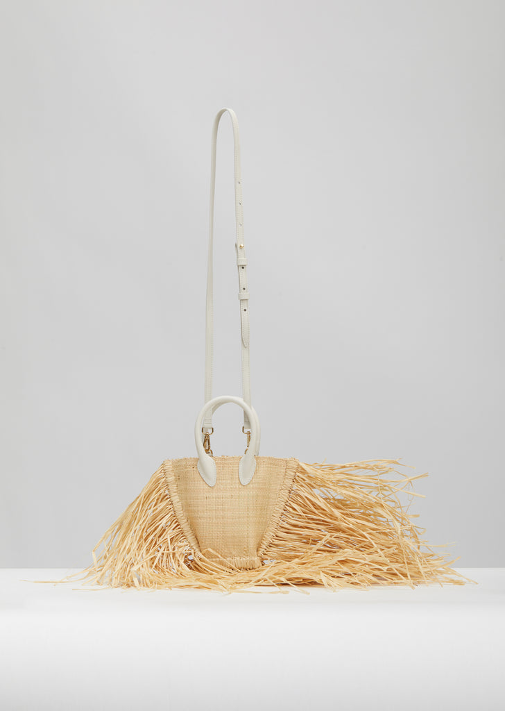 Natural-tone mini tote in plain-woven raffia straw, featuring exaggerated self-fringed edges, white leather top handles, and an optional adjustable crossbody strap.