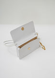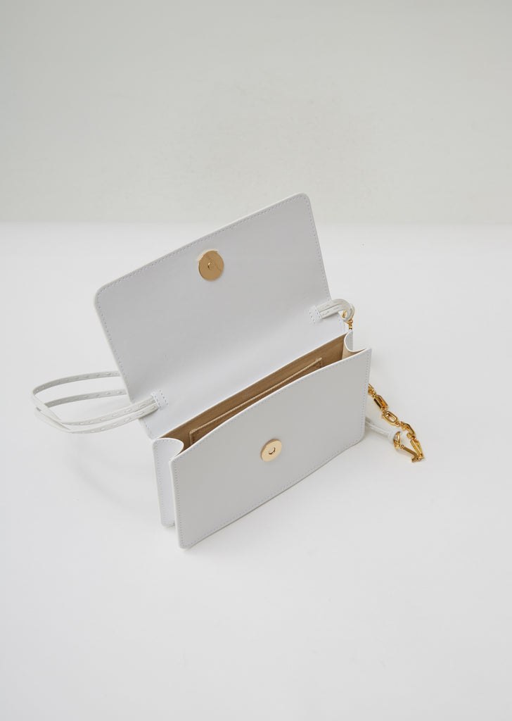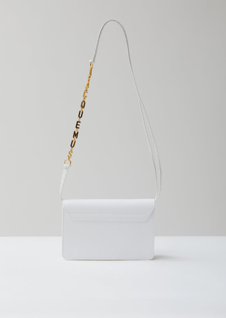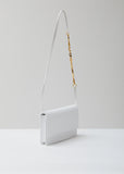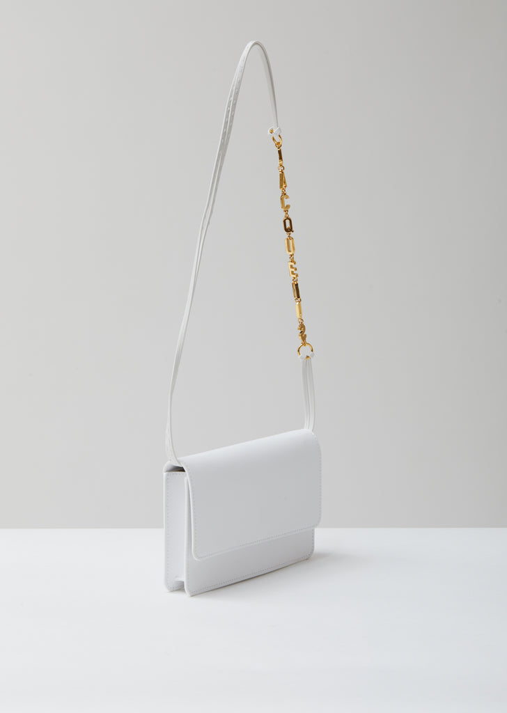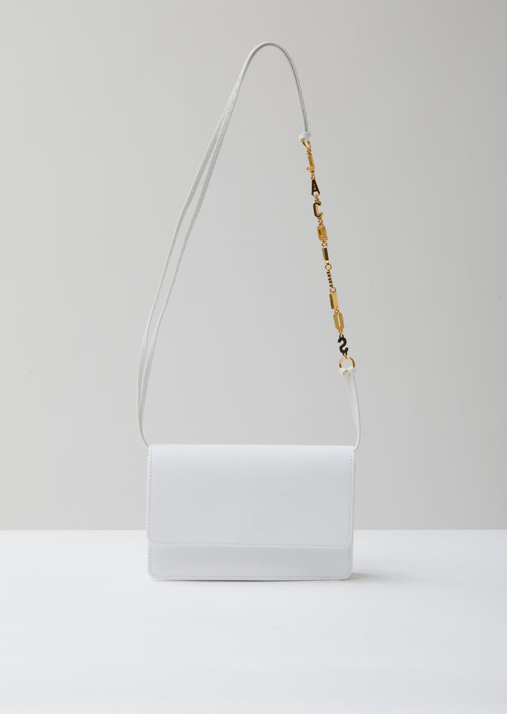 Structured pochette-style shoulder bag in smooth white cowhide leather, featuring a running-stitched leather shoulder strap accented with gold-tone metal logo-lettering charms. Concealed magnetic snap-button fastening at foldover flap. Expandable sides. Tonal lacquered edges. Tonal stitching. Interior slip pocket with logo-debossed leather patch. Lined.