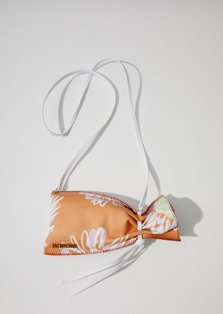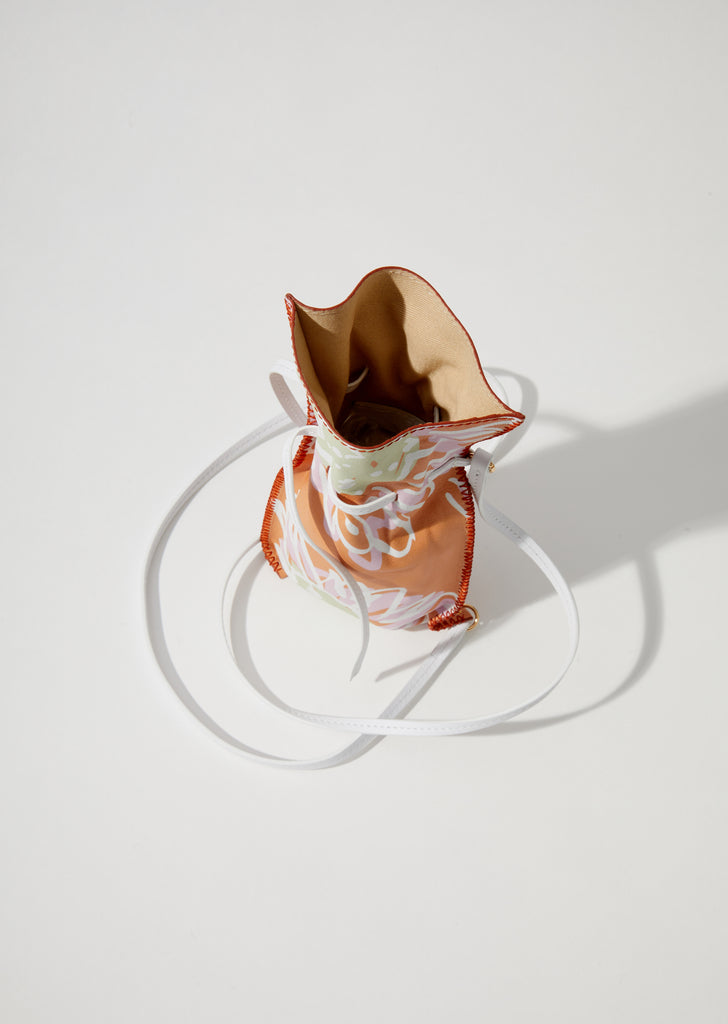 Orange drawstring-pouch bag in grained calfskin leather featuring a floral print of white, lavender, and green. This lightweight spring-summer accessory, inspired by traditional lavender sachets, is designed with a slim white leather crossbody strap.