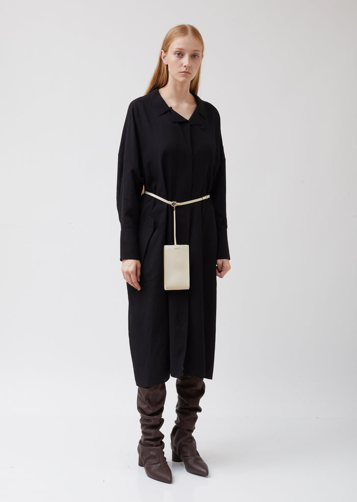 Almond calfskin smart-phone/accessories pouch with a tonal wristlet strap and detachable belt. Vertical rectangular silhouette. Snap-button tab closure. Silver heat-stamped logo at topline. Adjustable belt with ring/T-bar closure. Silver-tone-metal hardware throughout. Tonal lacquered edging and top-stitching.