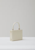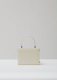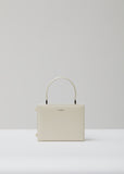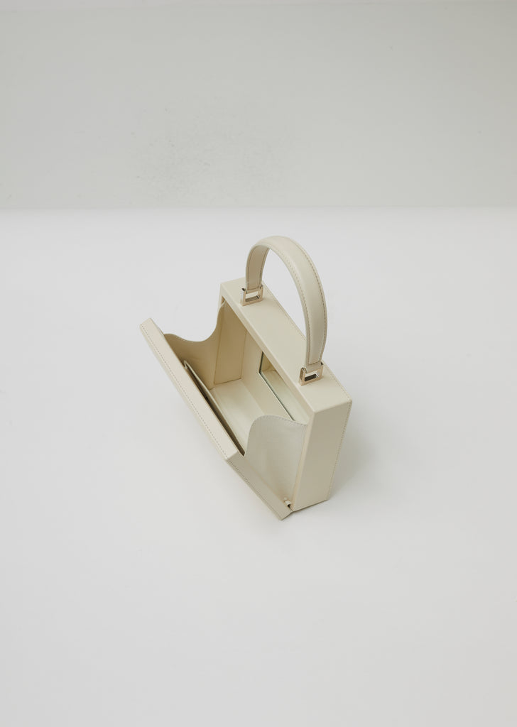 Small polished almond calfskin crossbody bag in a compact briefcase silhouette, finished a side handle for carrying. Structured rectangular silhouette. Concealed magnetic closure at side. Silver-stamped logo at front face. Flat pin-buckled leather crossbody/shoulder strap. Tonal top-stitching and lacquered edges throughout. Interior slip pocket and mirror.