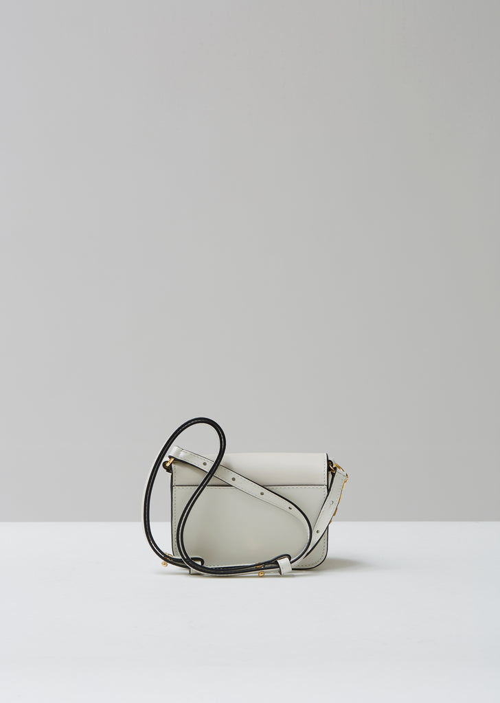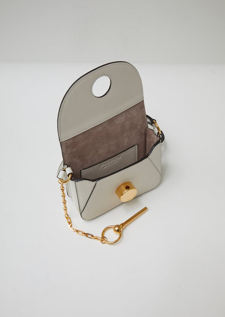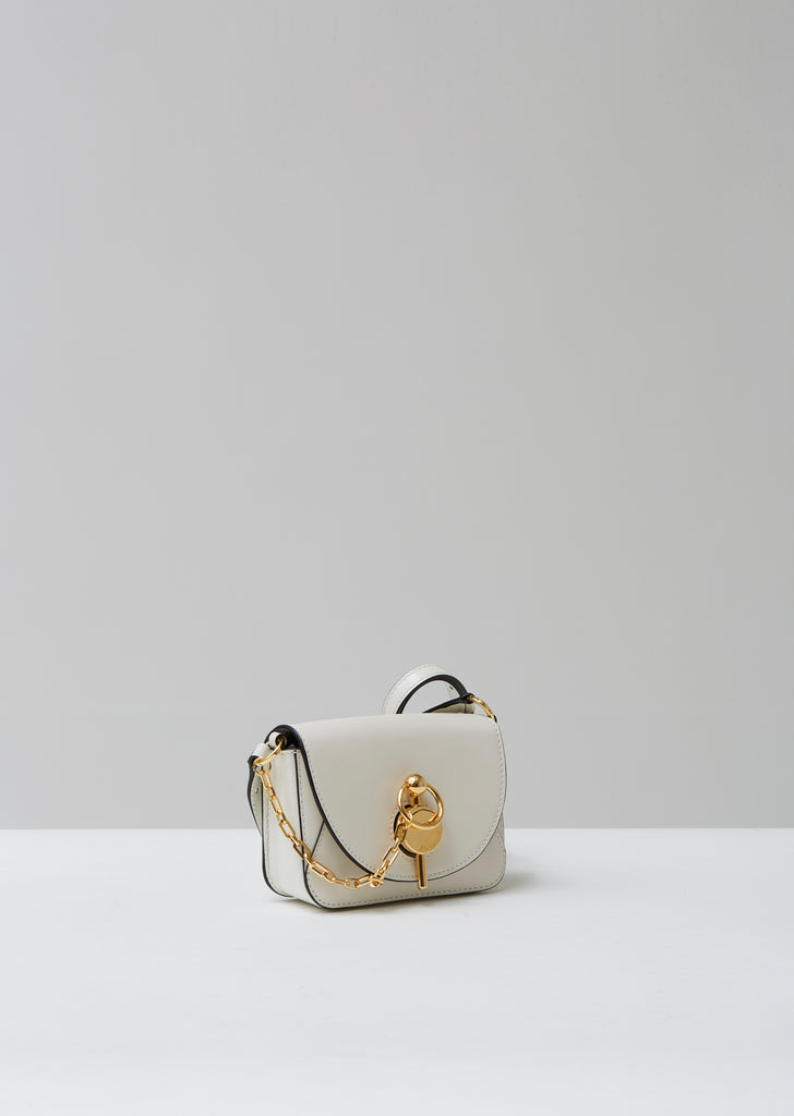 Small off-white calfskin crossbody bag featuring a gold-tone curb-chained key that secures through a branded disc at the front flap. Structured silhouette. Adjustable crossbody strap. Gold-tone brass hardware throughout. Tonal top-stitching throughout. Suede lining.